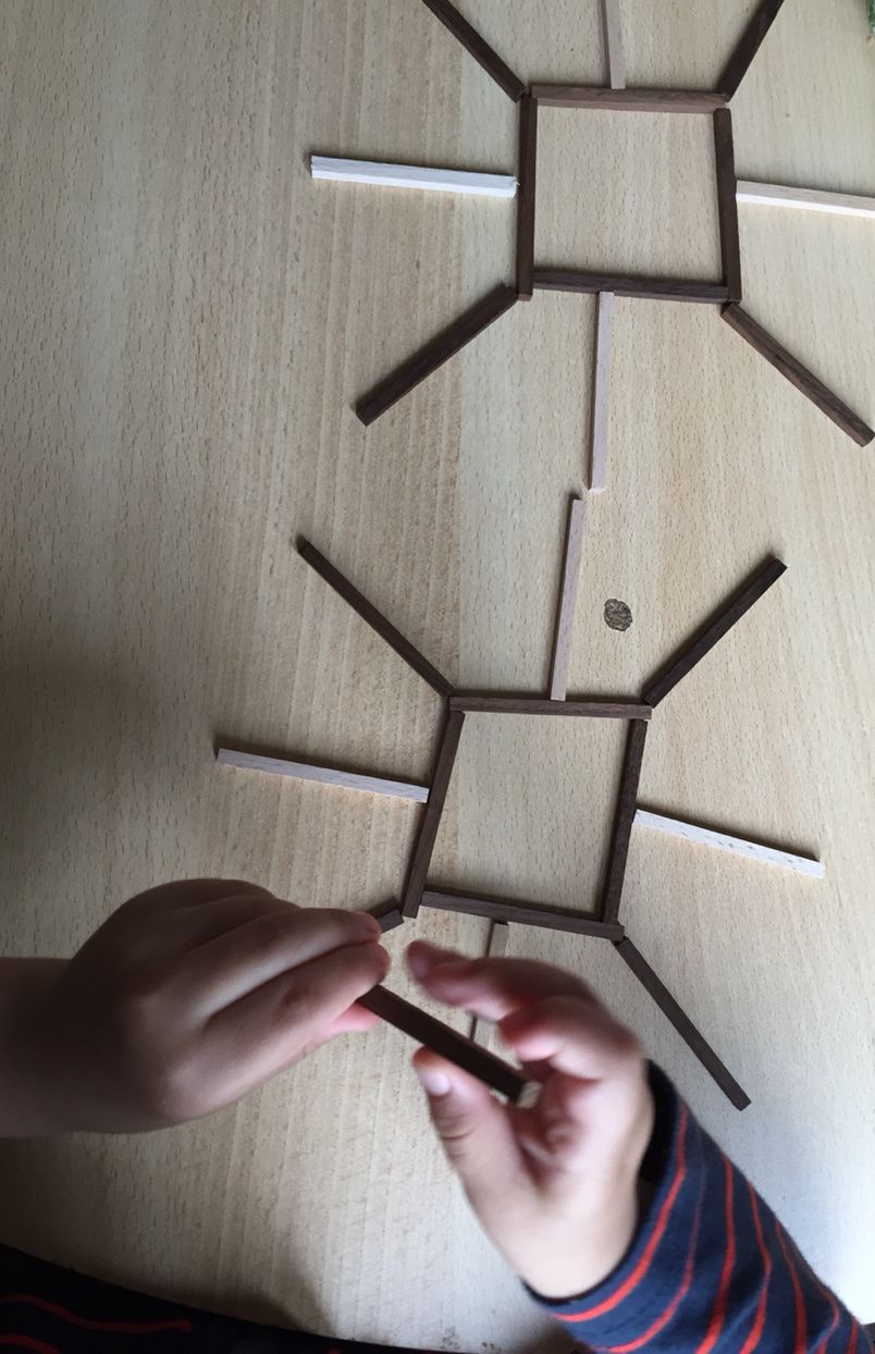 J'ai présenté aux loukoums un modèle réalisé avec des bâtonnets en bois, de deux couleurs différentes. Nour devait reproduire une cabane. Adam un soleil.